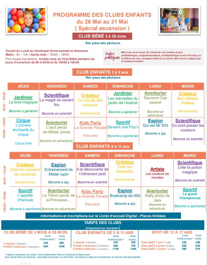 ***Les programmes sont renouvelés toutes les semaines. Les renseignements sont à prendre à l'accueil du Village***